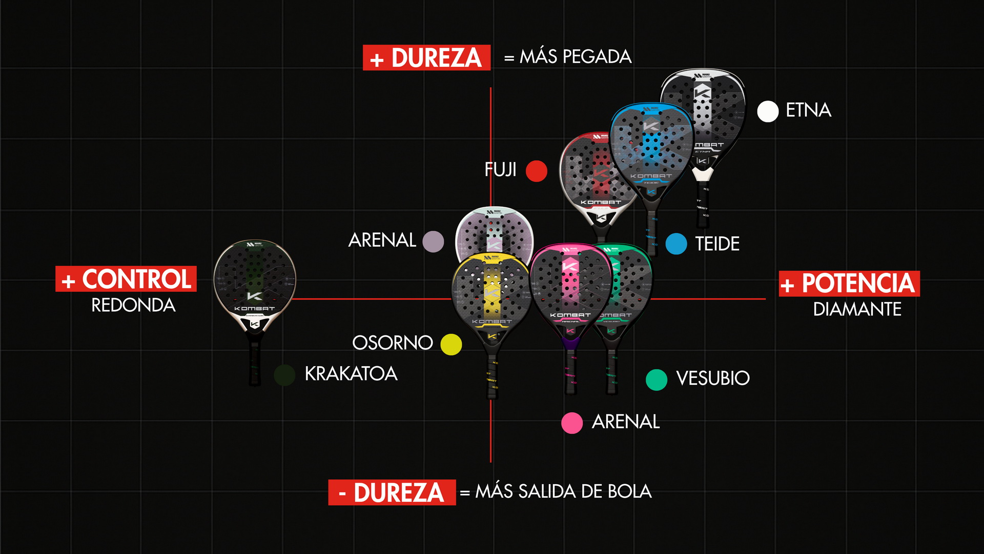 La Kombat Arenal es una pala hecha para acompañarte en las competiciones más exigentes. Con forma de diamante, tiene un comportamiento muy equilibrado entre control y potencia, por lo que funciona igual de bien en defensa como en ataque. Es una pala fácil de usar, con un balance alto, y muy polivalente, perfecta si estás mejorando tu nivel. Fabricada en carbono 18k y con un núcleo de Black Eva, ofrece una gran salida de bola. Te sentirás cómodo desde el primer momento, ya sea bloqueando, bandejeando o rematando. Una elección ideal para jugadores y jugadoras que quieren una pala fiable, equilibrada y lista para cualquier imprevisto durante el partido.
